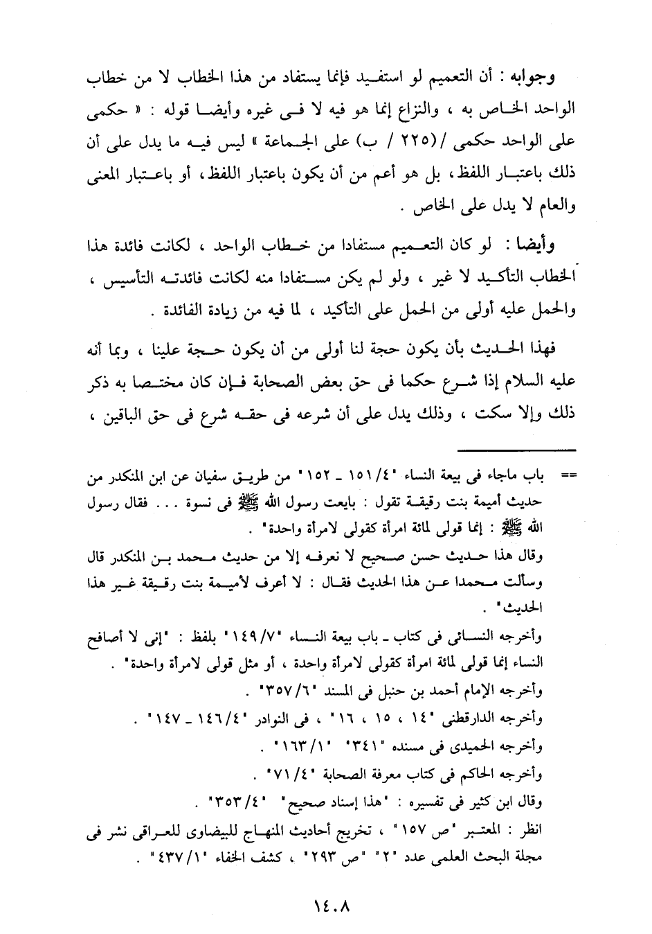 وجوابه: أن التعميم لو استفيد فإنما يستفاد من هذا الخطاب لا من خطاب الواحد الخاص به، والنزاع إنما هو فيه لا في غيره وأيضا قوله: "حكمي على الواحد حكمي/ (225/ب) على الجماعة" ليس فيه ما يدل على إن ذلك باعتبار اللفظ، بل هو أعم من أن يكون باعتبار اللفظ، أو باعتبار المعنى العام لا يدل على الخاص.