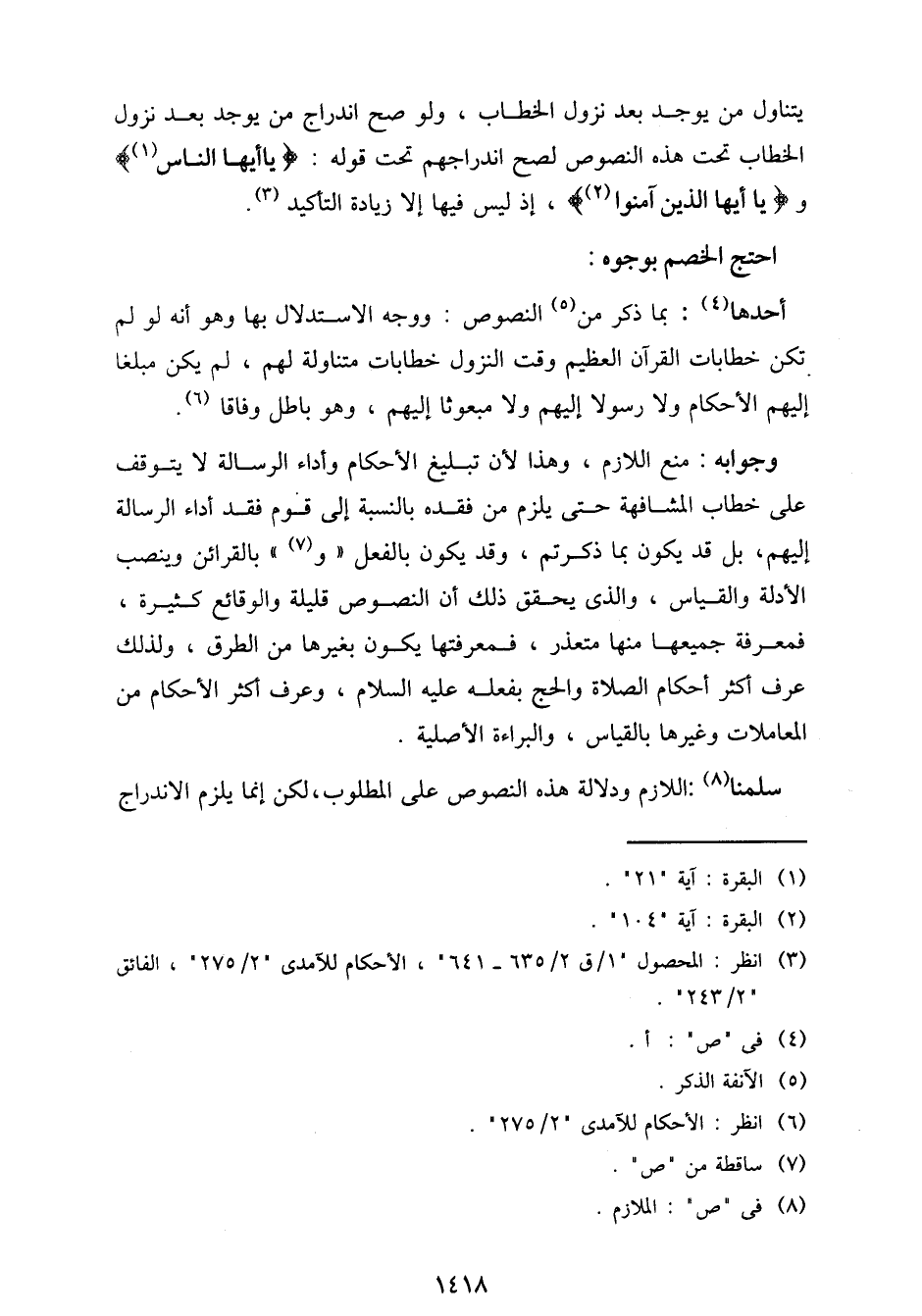 وجوابه: منع اللازم، وهذا لأن تبليغ الأحكام وأداء الرسالة لا يتوقف على خطاب المشافهة حتى يلزم من فقده بالنسبة إلى قوم فقد أداء الرسالة إليهم، بل قد يكون بما ذكرتم، وقد يكون بالفعل "و" بالقرائن وينصب الأدلة والقياس، والذي يحقق ذلك أن النصوص قليلة والوقائع كثيرة، فمعرفة جميعها منها متعذر، فمعرفتها يكون بغيرها من الطرق، ولذلك عرف أكثر أحكام الصلاة والحج بفعله عليه السلام، وعرف أكثر الأحكام من المعاملات وغيرها بالقياس، والبراءة الأصلية.