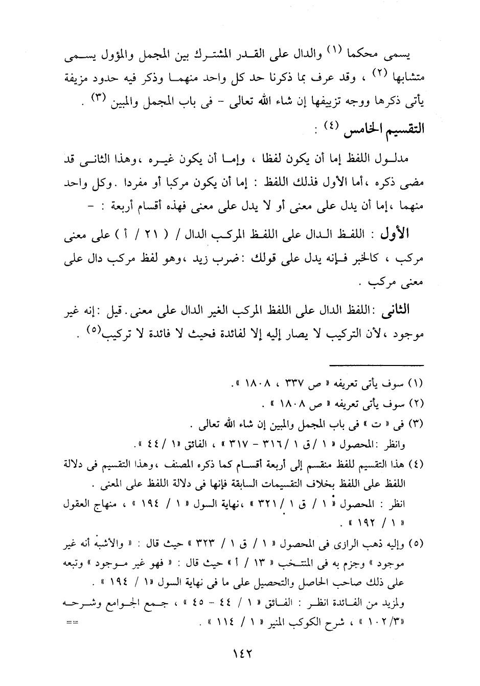 يسمى محكما والدال على القدر المشترك بين المجمل والمؤول يسمى متشابها، وقد عرف بما ذكرنا حد كل واحد منهما وذكر فيه حدود مزيفة يأتي ذكرها ووجه تزييفها إن شاء الله تعالى- في باب المجمل والمبين.