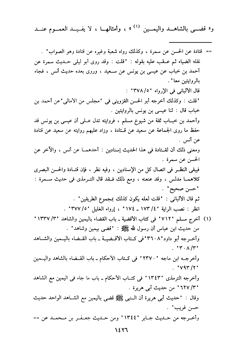 و"قضى بالشاهد واليمين"، وأمثالها، لا يفيد العموم عند