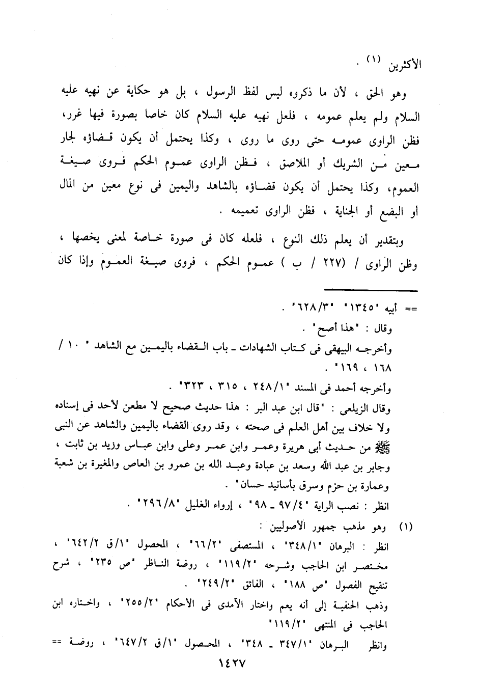 وهو الحق، لأن ما ذكروه ليس لفظ الرسول، بل هو حكاية عن نهيه عليه السلام ولم يعلم عمومه، فلعل نهيه عليه السلام كان خاصا بصورة فيها غرر، فظن الراوي عمومه حتى روى ما روي، وكذا يحتمل أن يكون قضاؤه لجار معين من الشريك أو الملاصق، فظن الراوي عموم الحكم فروى صيغة العموم، وكذا يحتمل أن يكون قضاؤه بالشاهد واليمين في نوع معين من المال أو البضع أو الجناية، فظن الراوي تعميمه.