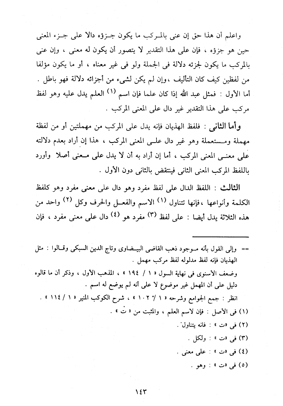 واعلم أن هذا حق أن عنى بالمركب ما يكون جزؤه دالا على جزء المعنى حين هو جزؤه، فإن على هذا التقدير لا يتصور أن يكون له معنى، وإن عنى بالمركب ما يكون لجزئه دلالة في الجملة ولو في غير معناه، أو ما يكون مؤلفا من لفظين كيف كان التأليف، وإن لم يكن لشيء من أجزائه دلالة فهو باطل. أما الأول: فمثل عبد الله إذا كان علما فإن اسم العلم يدل عليه وهو لفظ مركب على هذا التقدير غير دال على المعنى المركب.