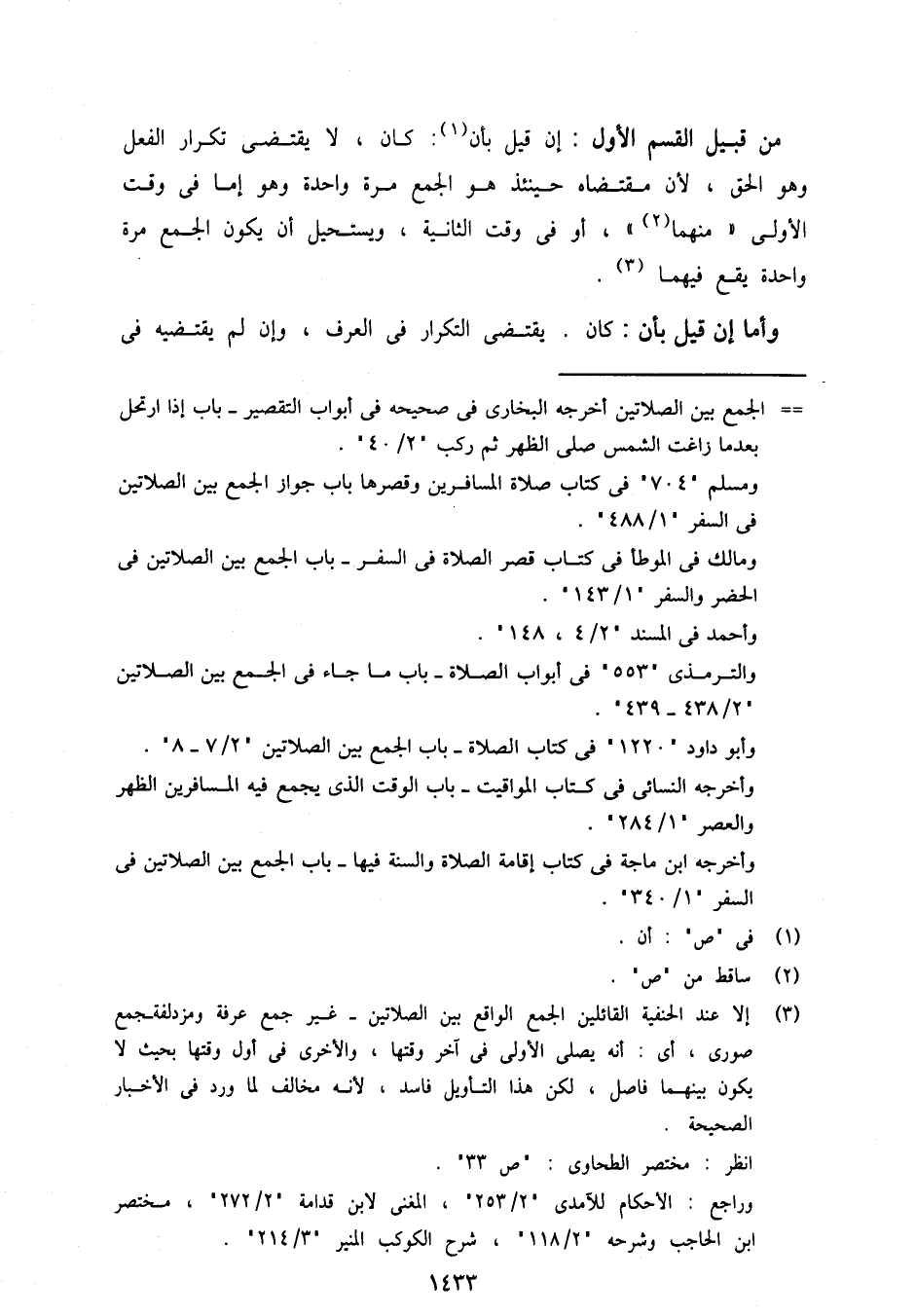 من قبيل القسم الأول: إن قيل بأن: كان، لا يقتضي تكرار الفعل وهو الحق، لأن مقتضاه حينئذ هو الجمع مرة واحدة وهو إما في وقت الأولى "منهما"، أو في وقت ثانية، ويستحيل أن يكون الجمع مرة واحدة يقع فيهما.