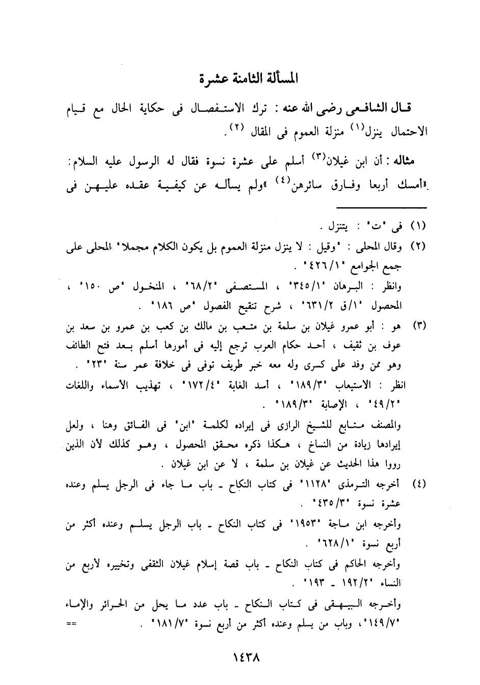 مثاله: أن ابن غيلان اسلم على عشرة نسوة فقال له الرسول عليه وسلم: "أمسك أربعا وفارق سائرهن" ولم يسأله عن كيفية عقده عليهن في