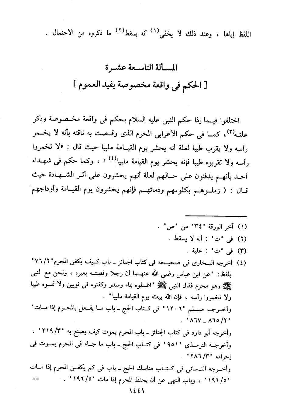 اختلفوا فيما إذا حكم النبي عليه السلام بحكم في واقعة مخصوصة وذكر علته، كما في حكم الأعرابي المحرم الذي وقصت به ناقته بأنه لا يخمر رأسه ولا يقرب طيبا لعلة أنه يحشر يوم القيامة ملبيا حيث قال: "لا تخمروا رأسه ولا تقربوه طيبا فإنه يحشر يوم القيامة ملبيا"، وكما حكم في شهداء أحد بأنهم يدفنون على حالهم لعلة أنهم يحشرون على أثر الشهادة حيث قال: (زملوهم بكلومهم ودمائهم فإنهم يحشرون يوم القيامة وأوداجهم