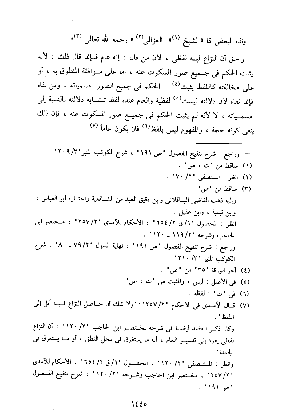 والحق أن النزاع فيه لفظي، لأن من قال: إنه عام فإنما قال ذلك: لأنه يثبت الحكم في جميع صور المسكوت عنه، إما على موافقة المنوط به، أو على مخالفته كاللفظ يثبت الحكم في جميع الصور مسمياته، ومن نفاه فإنما نفاه لأن دلالته ليست لفظية والعام عنده لفظ تتشابه دلالته بالنسبة إلى مسمياته، لا لأنه لم يثبت الحكم في جميع صور المسكوت عنه، فإن ذلك ينفي كونه حجة، والمفهوم ليس بلفظ فلا يكون عامًا.
