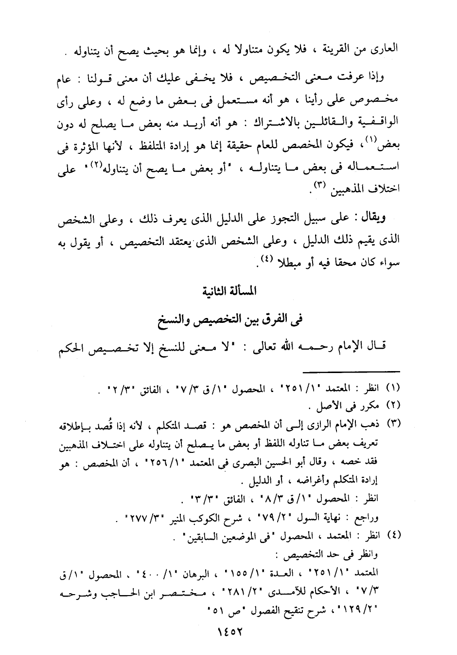 وإذا عرفت معنى التخصيص، فلا يخفى عليك أن معنى قولنا: عام مخصوص على رأينا، هو أنه مستعمل في بعض ما وضع له، وعلى رأي الواقفية والقائلين بالاشتراك: هو أنه أريد منه بعض ما يصلح له دون بعض، فيكون المخصص للعام حقيقة إنما هو إرادة المتلفظ، لأنها المؤثرة في استعماله في بعض ما يتناوله، "أو بعض ما يصح أن يتناوله" على اختلاف المذهبين.