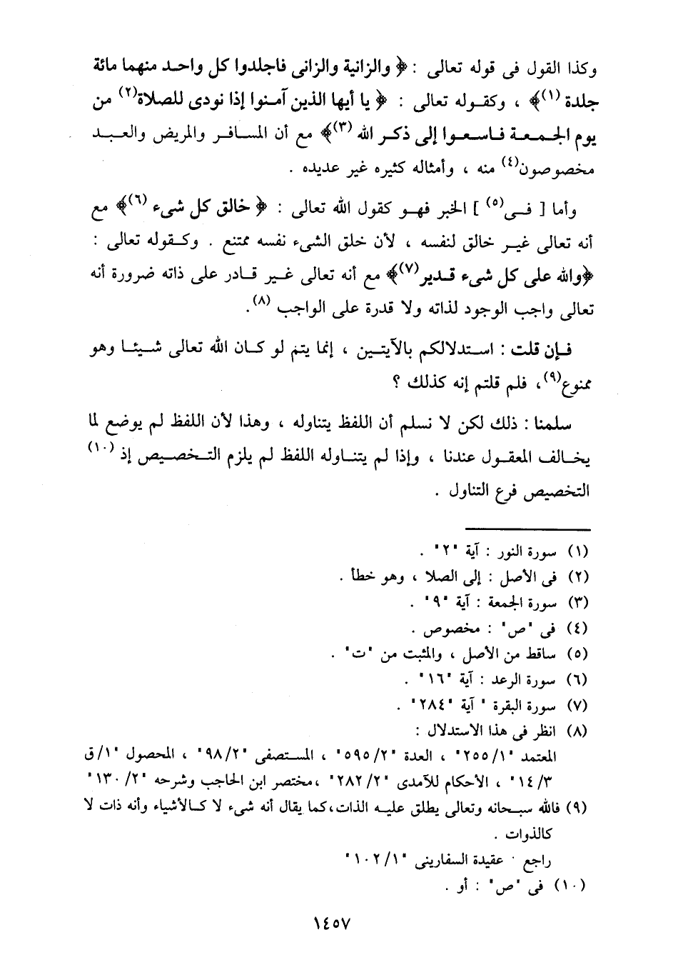 وكذا القول في قوله تعالى: {والزانية والزاني فاجلدوا كل واحد منهما مائة جلدة}، وكقوله تعالى: {يا أيها الذين آمنوا إذا نودي للصلاة من يوم الجمعة فاسعوا إلى ذكر الله} مع أن المسافر والمريض والعبد مخصوصون منه، وأمثاله كثيرة غير عديدة.
