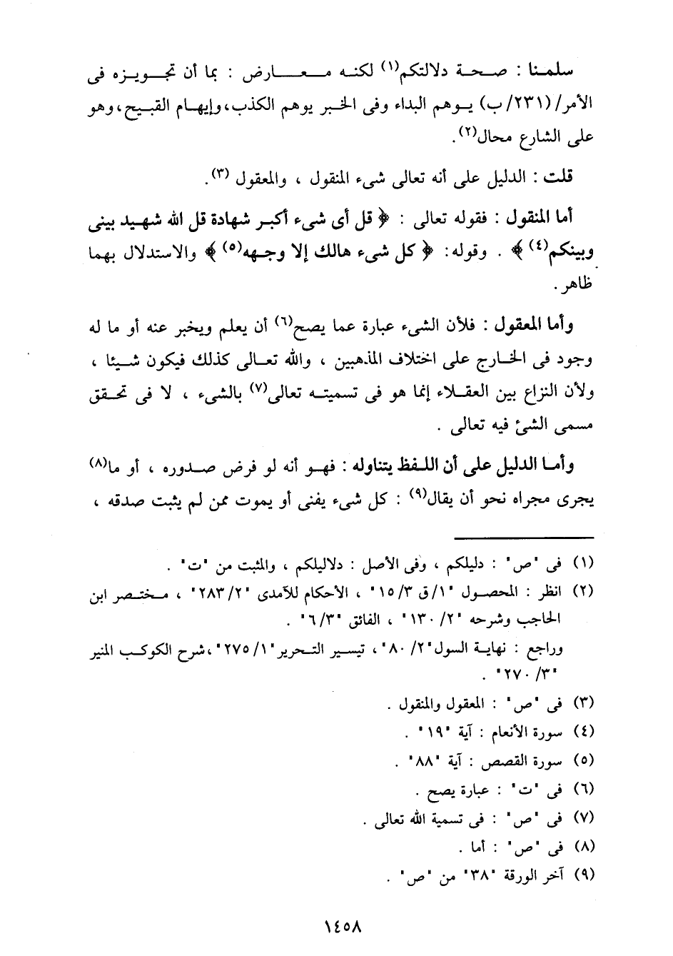 أما المنقول: فقوله تعالى: {قل أي شيء أكبر شهادة قل الله شهيد بيني وبينكم}. وقوله: {كل شيء هالك إلا وجهه} والاستدلال بهما ظاهر.