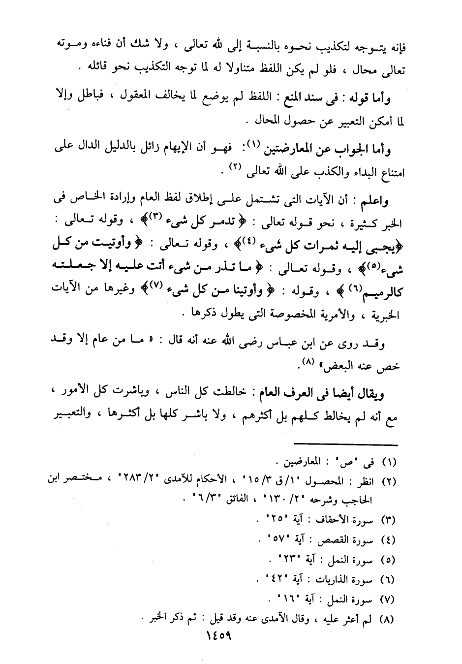 واعلم: أن الآيات التي تشتمل على إطلاق لفظ العام وإرادة الخاص في الخبر كثيرة، نحو قوله تعالى: {تدمر كل شيء}، وقوله تعالى: {يجبي إليه ثمرات كل شيء}، وقوله تعالى: {وأوتيت من كل شيء}، وقوله تعالى: {ما تذر من شيء أتت عليه إلا جعلته كالرميم}، وقوله: {وأوتينا من كل شيء} وغيرها من الآيات الخبرية، والأمرية المخصوصة التي يطول ذكرها.