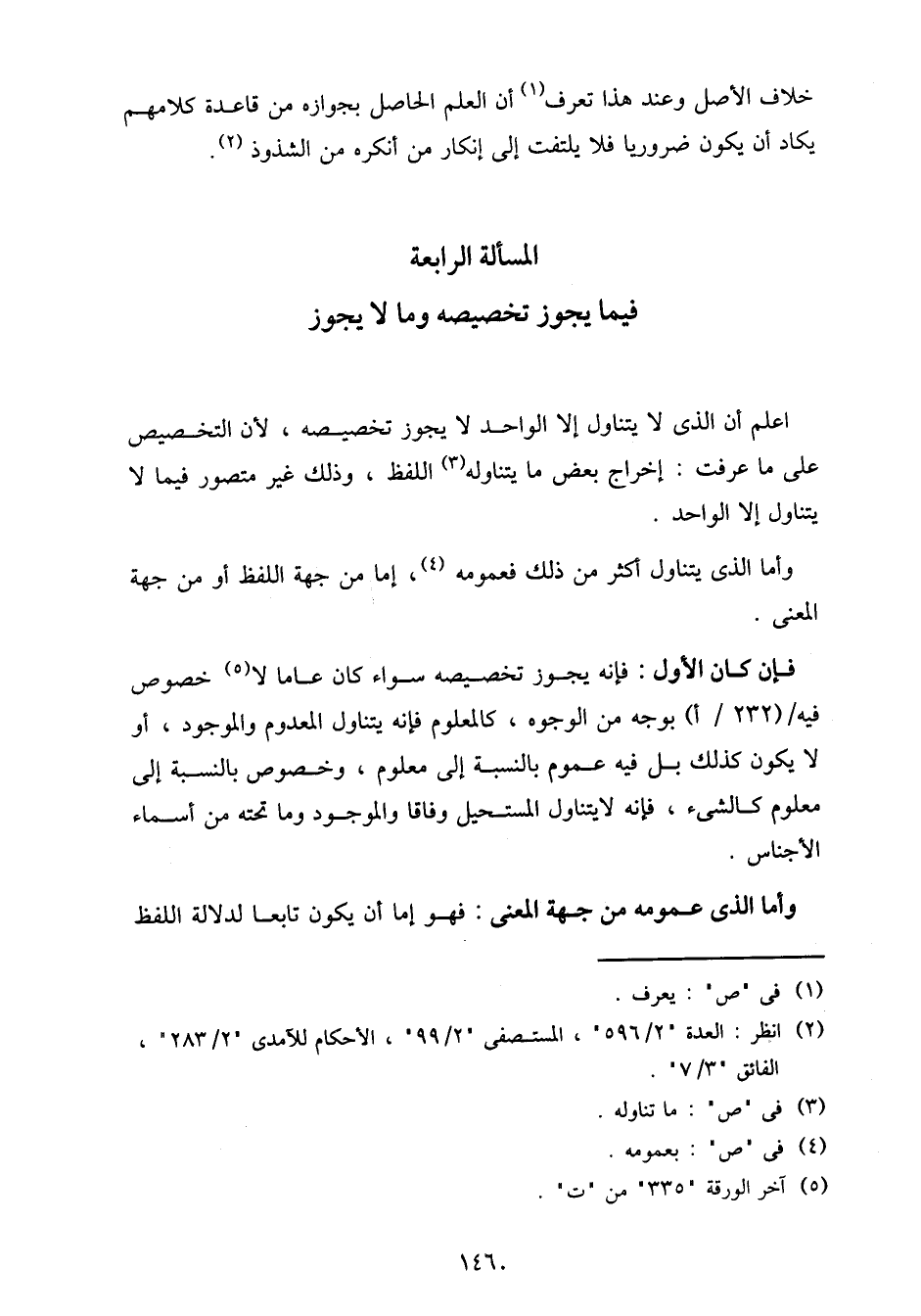 فإن كان الأول: فإنه يجوز تخصيصه سواء كان عاما لا خصوص فيه/ (232/أ) بوجه من الوجوه، كالمعلوم يتناول المعدوم والموجود، أو لا يكون كذلك بل فيه عموم بالنسبة إلى معلوم، وخصوص بالنسبة إلى معلوم كالشيء، فإنه لا يتناول المستحيل وفاقا والموجود وما تحته من أسماء الأجناس.