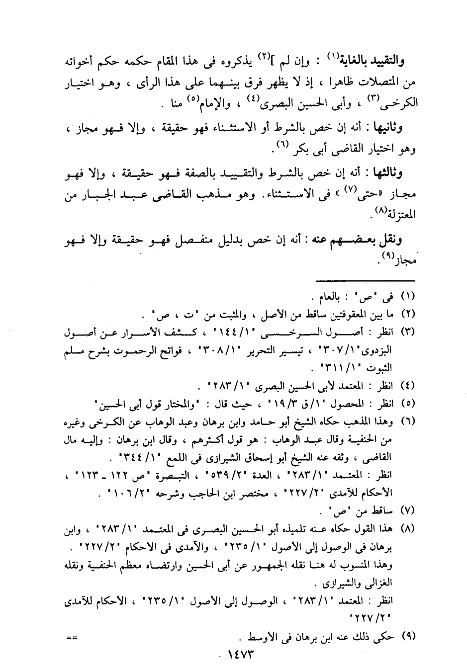والتقييد بالغاية: وإن لم] يذكروه في هذا المقام حكمه حكم أخواته من المتصلات ظاهرا، إذ لا يظهر فرق بينهما على هذا الرأي، وهو اختيار الكرخي، وأبي الحسين البصري، والإمام منا.