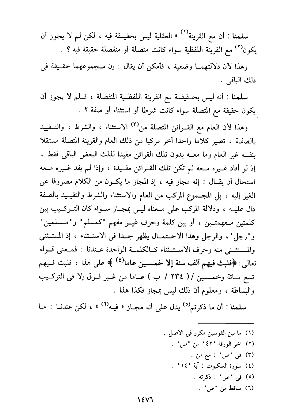 وهذا لأن العام مع القرائن المتصلة من الاستثناء، والشرط، والتقييد بالصفة، تصير كلاما واحدا آخر مركبا من ذلك العام والقرينة المتصلة مستقلا بنفسه غير العام وما معه بدون تلك القرائن مفيدا لذلك البعض الباقي فقط، إذا لو أفاد غيره معه لم تكن تلك القرائن مفيدة، وإذا لم يفد غيره معه استحال أن يقال: إنه مجاز فيه، إذ المجاز ما يكون من الكلام مصروفا عن الغير إليه، بل المجموع المركب من العام والاستثناء والشرط والتقييد بالصفة دال عليه، ودلالة المركب على معناه ليس بمجاز سواء كان التركيب بين كلمتين مفهمتين، أو بين كلمة وحرف غير مفهم "كمسلم" و"مسلمين" و"رجل"، والرجل وهذا الاحتمال يظهر جدا في الاستثناء، إذ المستثنى والمستثنى منه وحرف الاستثناء كالكلمة الواحدة عندنا: فمعنى قوله تعالى: {فلبث فيهم ألف سنة إلا خمسين عاما} على هذا، فلبث فيهم تسع مائة وخمسين/ (234/ب) عاما من غير فرق إلا في التركيب والبساطة، ومعلوم أن ذلك ليس بمجاز فكذا هذا.