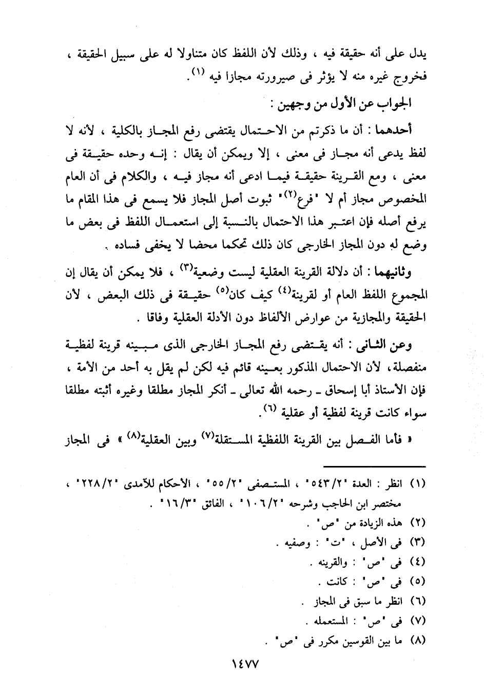 وعن الثاني: أنه يقتضي رفع المجاز الخارجي الذي مبينه قرينة لفظية منفصلة، لأن الاحتمال المذكور بعينه قائم فيه لكن لم يقل به أحد من الأمة، فإن الأستاذ أبا إسحاق- رحمه الله تعالى- أنكر المجاز مطلقا وغيره أثبته مطلقا سواء كانت قرينة لفظية أو عقلية.