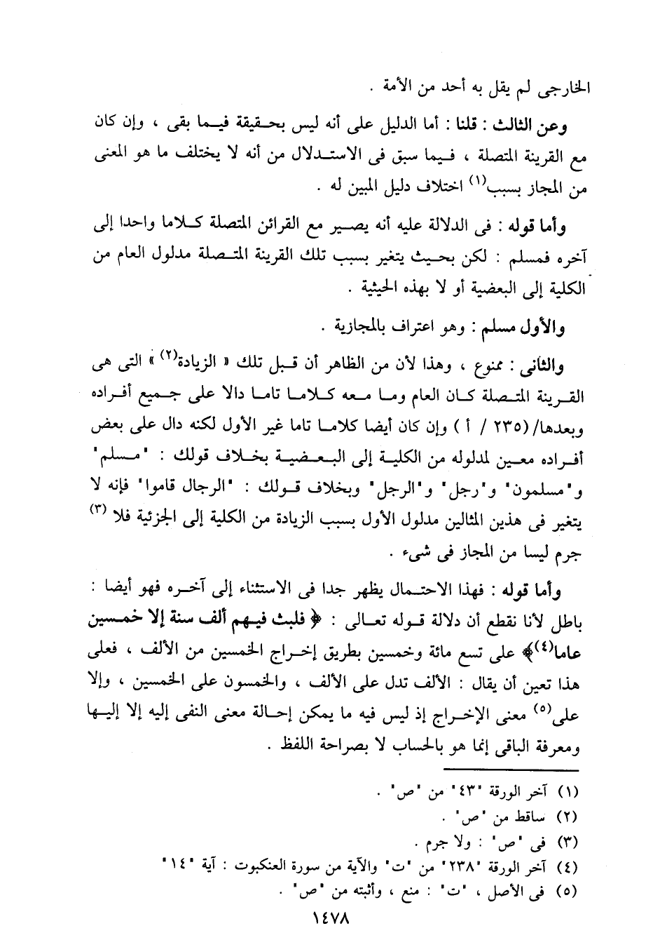 وأما قوله: فهذا الاحتمال يظهر جدا في الاستثناء إلى آخره فهو أيضا: باطل لأنا نقطع أن دلالة قوله تعالى: {فلبث فيهم ألف سنة إلا خمسين عاما} على تسع مائة وخمسين بطريق إخراج الخمسين من الألف، فعلى هذا تعين أن يقال: الألف تدل على الألف، والخمسون على الخمسين، وإلا على معنى الإخراج إذ ليس فيه ما يمكن إحالة معنى النفي إليه إلا إليها ومعرفة الباقي إنما هو بالحساب لا بصراحة اللفظ.
