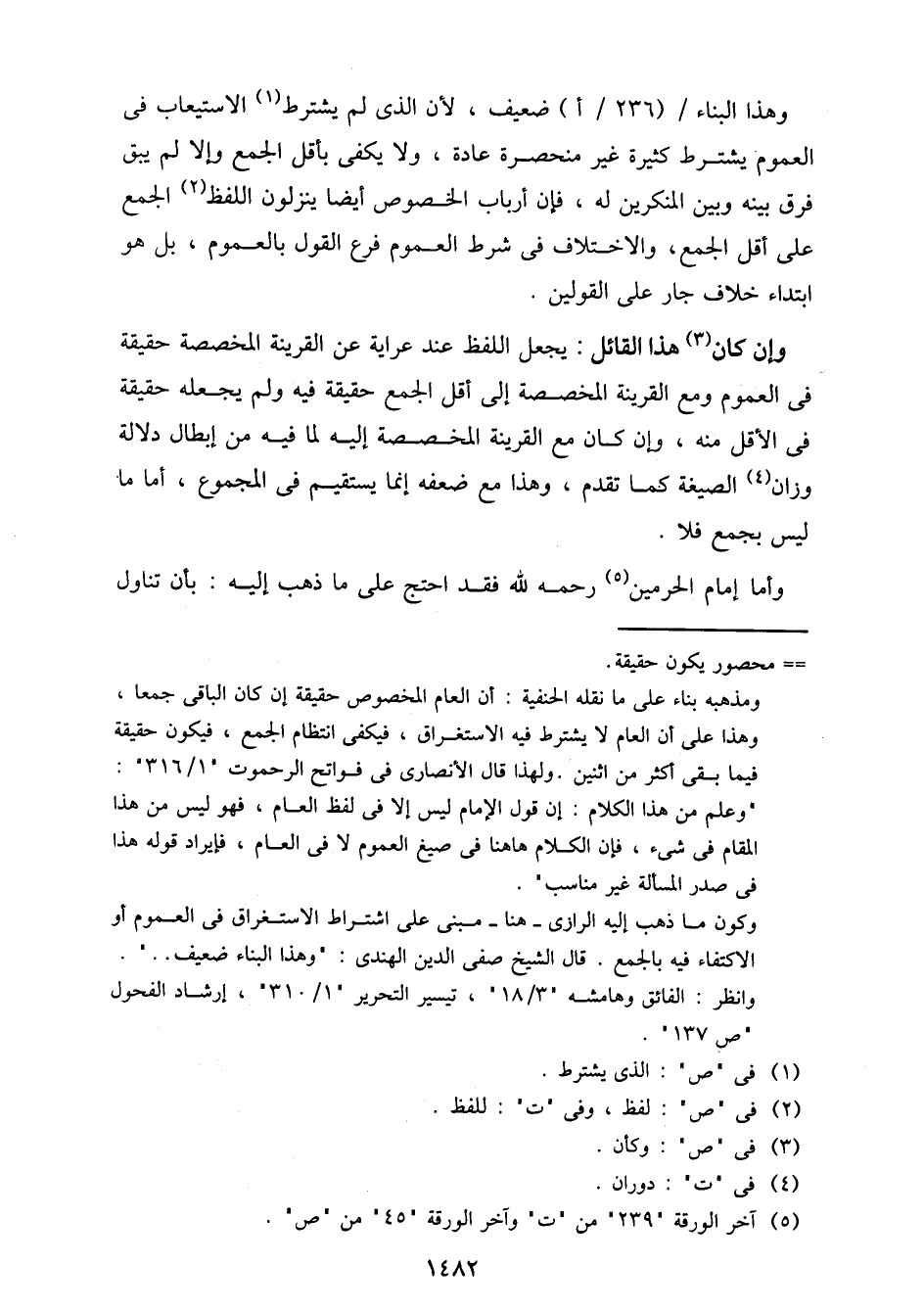 وهذا البناء/ (236/أ) ضعيف، لأن الذي لم يشترط الاستيعاب في العموم يشترط كثيرة غير منحصرة عادة، ولا يكفي بأقل الجمع وإلا لم يبق فرق بينه وبين المنكرين له، فإن أرباب الخصوص أيضا ينزلون اللفظ الجمع على أقل الجمع، والاختلاف في شرط العموم فرع القول بالعموم، بل هو ابتداء خلاف جار على القولين.