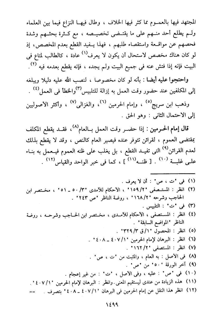 المجتهد فيها بالعموم مما كثر فيها الخلاف، وطال فيها النزاع فيما بين العلماء ولم يطلع أحد منهم على ما يقتضي تخصيصه، مع كثرة بحسم وشدة فحصهم عن مواقعة واستقصاء طلبهم، فهذا يفيد القطع بعدم المخصص، إذ لو كان هناك مخصص لاستحال أن يكون لا يعرف عادة، كالطالب لمتاع في البيت إذا فتش عنه في جميع البيت ولم يجده، يقطع بعدمه فيه.
