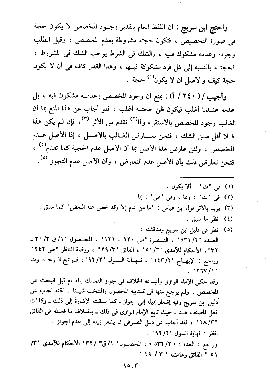 واحتج ابن سريج: أن اللفظ العام بتقدير وجود المخصص لا يكون حجة في صورة التخصيص، فتكون حجته مشروطة بعدم المخصص، وقبل الطلب وجوده وعدمه مشكوك فيه، والشك في الشرط يوجب الشك في المشروط، فحجته بالنسبة إلى كل فرد مشكوكة فيها، وهذا القدر كاف في أن لا يكون حجة كيف والأصل أن لا يكون حجة.