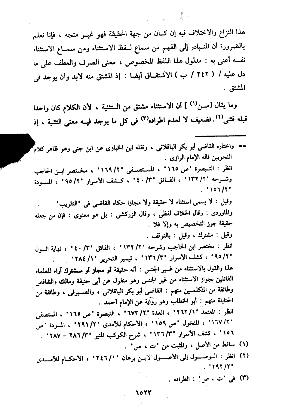 هذا النزاع والاختلاف فيه إن كان من جهة الحقيقة فهو غير متجه، فإنا نعلم بالضرورة أن المتبادر إلى الفهم من سماع لفظ الاستثناء ومن سماع الاستثناء نفسه أعنى به: مدلول هذا اللفظ المخصوص، معنى الصرف والعطف على ما دل عليه/ (242/ ب) الاشتقاق أيضا: إذ المشتق منه لابد وأن يوجد في المشق.