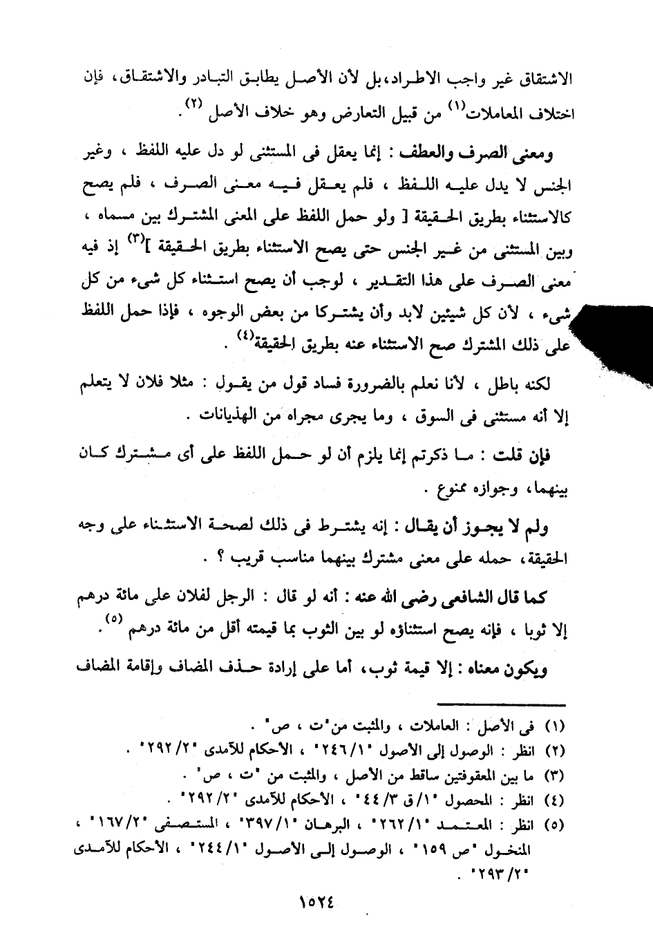 ومعنى الصرف والعطف: إنما يعقل في المستثنى لو دل عليه اللفظ، وغير الجنس لا يدل عليه اللفظ، فلم يعقل فيه معنى الصرف، فلم يصح كالاستثناء بطريق الحقيقة [ولو حمل اللفظ على المعنى المشترك بين مسماه، وبين المستثنى من غير الجنس حتى يصح الاستثناء بطريق الحقيقة] إذ فيه معنى الصرف على هذا التقدير، لوجب أن يصح استثناء كل شيء من كل شيء، لأن كل شيئين لابد وأن يشتركا من بعض الوجوه، فإذا حمل اللفظ على ذلك المشترك صح الاستثناء عنه بطريق الحقيقة.
