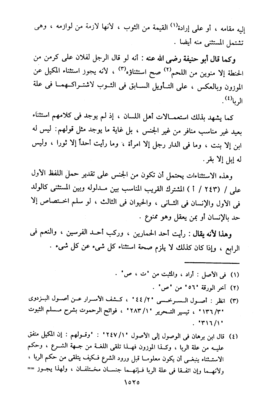 وكما قال أبو حنيفة رضي الله عنه: أنه لو قال الرجل لفلان علي كر من من الحنطة إلا منوين من اللحم صح استثناؤه، لأنه يجوز استثناء المكيل عن الموزون وبالعكس، على التأويل السابق في الثوب لاشتراكهما في علة الربا.
