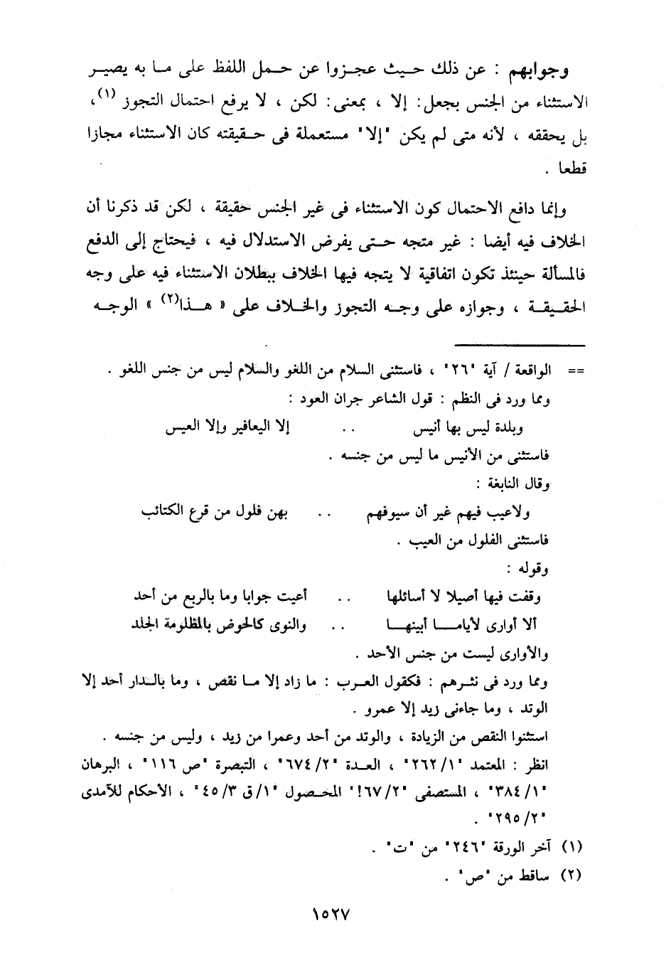 وجوابهم: عن ذلك حيث عجزوا عن حمل اللفظ على ما به يصير الاستثناء من الجنس بجعل: إلا، بمعنى: لكن، لا يرفع احتمال التجوز، بل يحققه، لأنه متى لم يكن "إلا" مستعملة في حقيقته كان الاستثناء مجازا قطعا.