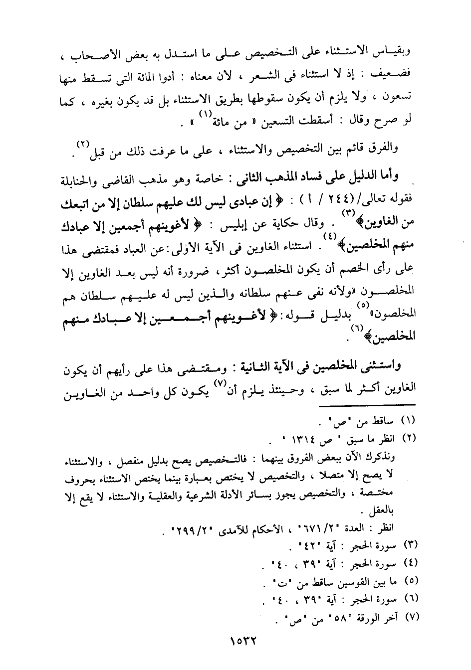 وأما الدليل على فساد المذهب الثاني: خاصة وهو مذهب القاضي والحنابلة فقوله تعالى/ (244/ أ): {إن عبادي ليس عليك سلطان إلا من اتبعك من الغاوين}. وقال حكاية عن إبليس: {لأغوينهم أجمعين إلا عبادك منهم المخلصين}. استثناء الغاوين في الآية الأولى: عن العباد فمقتضى هذا على رأي الخصم أن يكون المخلصون أكثر، ضرورة أنه ليس بعد الغاوين إلا المخلصون "ولأنه نفى عنهم سلطانه والذين ليس له عليهم سلطان هم المخلصون" بدليل قوله: {لأغوينهم أجمعين إلا عبادك منهم المخلصين}.
