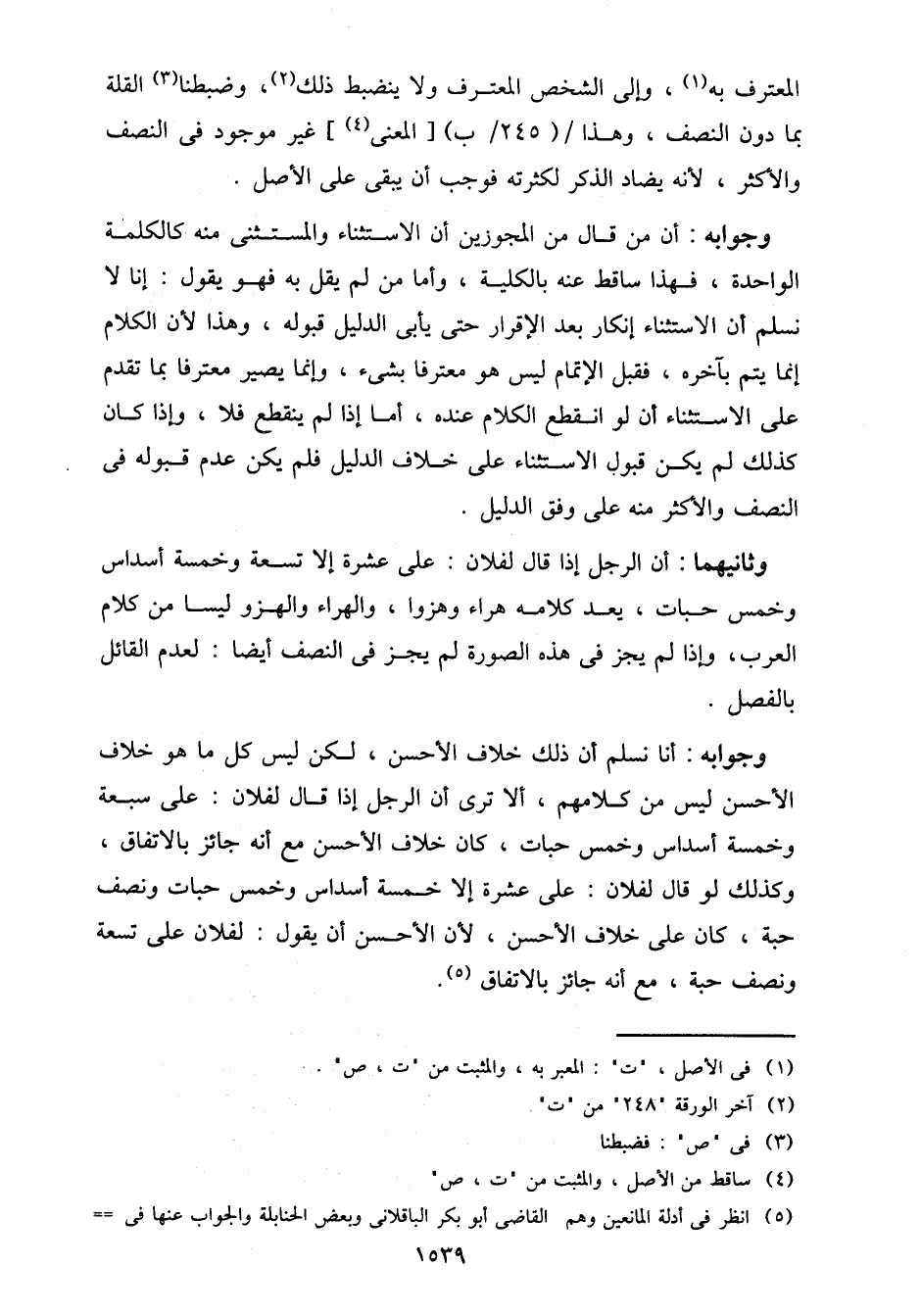 وجوابه: أنا نسلم أن ذلك خلاف الأحسن، لكن ليس كل ما هو خلاف الأحسن ليس من كلامهم، ألا ترى أن الرجل إذا قال لفلان: على سبعة وخمسة أسداس وخمس حبات، كان خلاف الأحسن مع أنه جائز بالاتفاق، وكذلك لو قال لفلان: على عشرة إلا خمسة أسداس وخمس حبات ونصف حبة، كان على خلاف الأحسن، لأن الأحسن أن يقول: لفلان على تسعة ونصف حبة، مع أنه جائز بالاتفاق.
