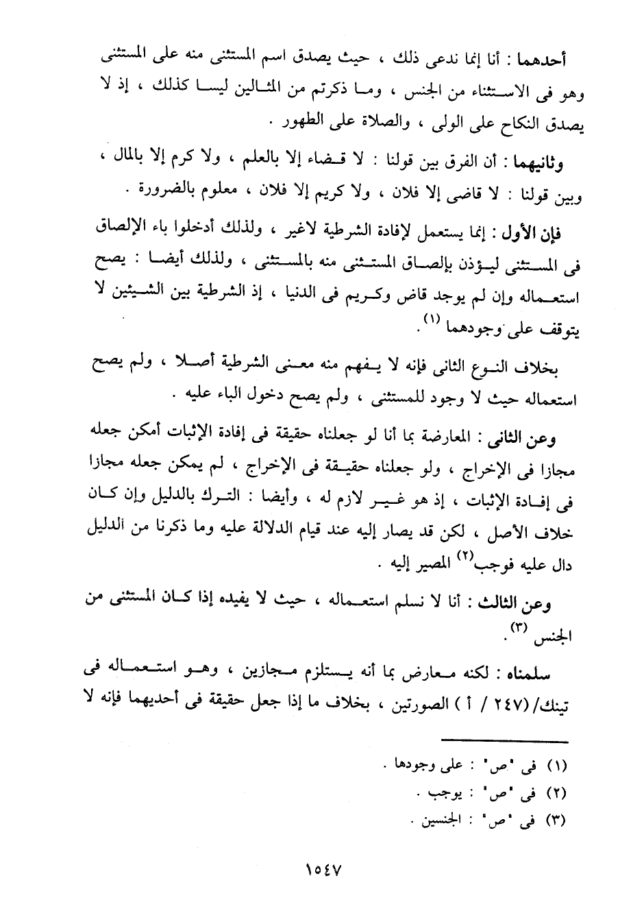 فإن الأول: إنما يستعمل لإفادة الشرطية لا غير، ولذلك أدخلوا باء الإلصاق في المستثنى ليؤذن بإلصاق المستثنى منه بالمستثنى، ولذلك أيضا: يصح استعماله وإن لم يوجد قاض وكريم في الدنيا، إذ الشرطية بين الشيئين لا يتوقف على وجودهما.
