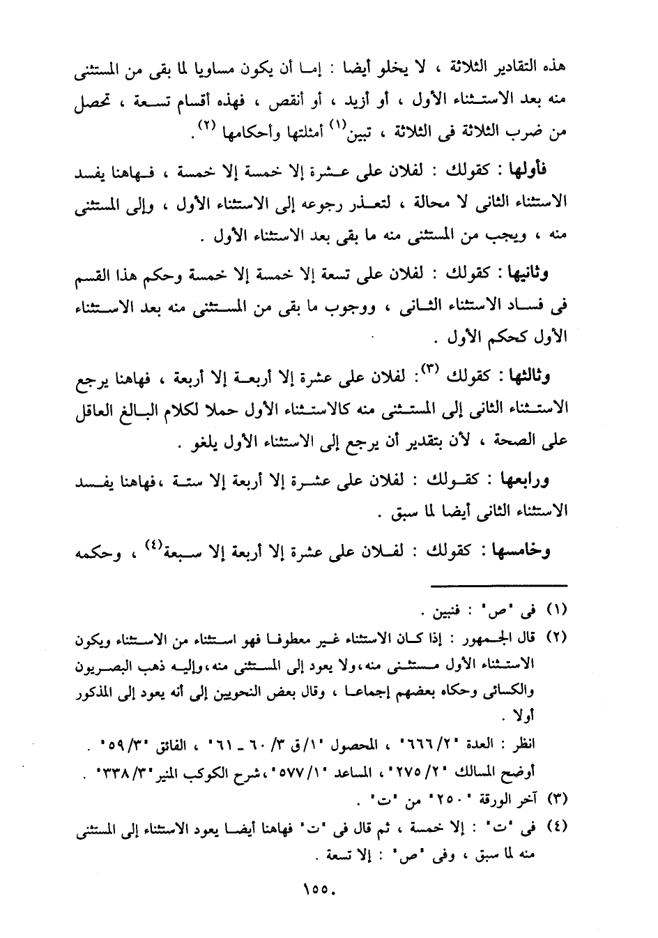 فأولها: كقولك: لفلان على عشرة إلى خمسة إلا خمسة، فهاهنا يفسد الاستثناء الثاني لا محالة، لتعذر رجوعه إلى الاستثناء الأول، وإلى المستثنى منه، ويجب من المستثنى من ما بقى بعد الاستثناء الأول.