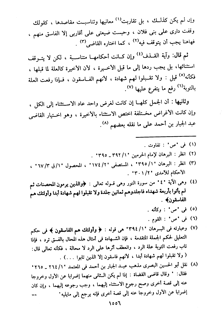 ثم قال: وآية القذف وإن كانت أحكامها متناسبة، لكن لا يتوقف استثنائها، بل يجب ردها إلى ما قبل الأخيرة، لأن الأخيرة كالعلة لما قبلها، فكأنه قيل: ولا تقبلوا لهم شهادة، لأنهم الفاسقون، فإذا رفعت العلة بالتوبة رفع ما يتفرع عليها.