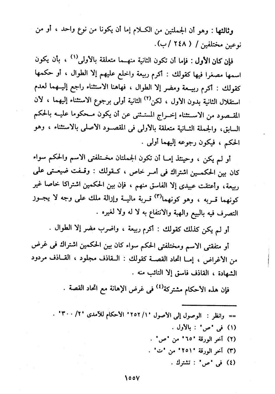 أو لم يكن، وحينئذ إما أن تكون الجملتان مختلفتي الاسم والحكم سواء كان بين الحكمين اشتراك في أمر خاص، كقولك: وقفت ضيعتي على ربيعة، وأعتقت عبيدي إلا لفاسق منهم، فإن بين الحكمين اشتراكا خاصا غير كونهما قربه، وهو كونهما قربة مالية وإزالة ملك على وجه لا يجوز التصرف فيه بالبيع والهبة والانتفاع به لا له ولا لغيره.