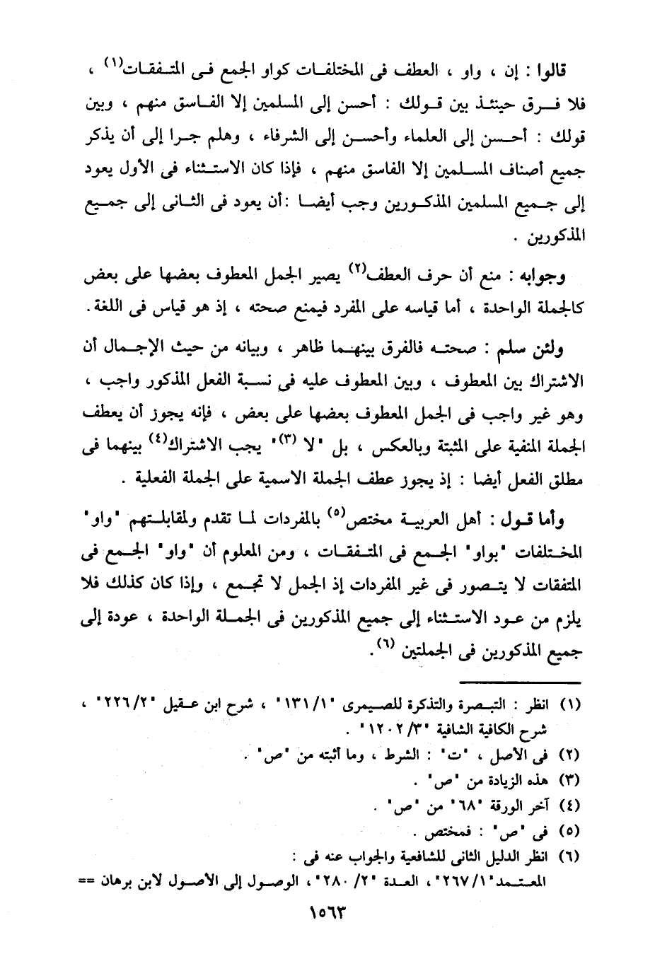 قالوا: إن، واو، العطف في المختلفات كواو الجمع في المتفقات، فلا فرق حينئذ بين قولك: أحسن إلى المسلمين إلا الفاسق منهم، وبين قولك: أحسن إلى العلماء وأحسن إلى الشرفاء، وهلم جرا إلى أن يذكر جميع أصناف المسلمين إلا الفاسق منهم، فإذا كان الاستثناء في الأول يعود إلى جميع المسلمين المذكورين وجب أيضًا: أن يعود في الثاني إلى جميع المذكورين.