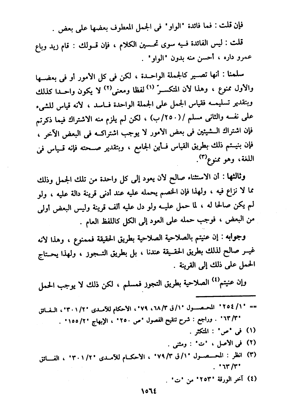 وثالثها: أن الاستثناء صالح لأن يعود إلى كل واحدة من تلك الجمل وذلك مما لا نزاع فيه، ولهذا فإن الخصم يحمله عليه عند أدنى قرينة دالة عليه، ولو لم يكن صالحا له، لما حمل عليه ولو دل عليه ألف قرينة وليس البعض أولى من البعض، فوجب حمله على العود إلى الكل كاللفظ العام.