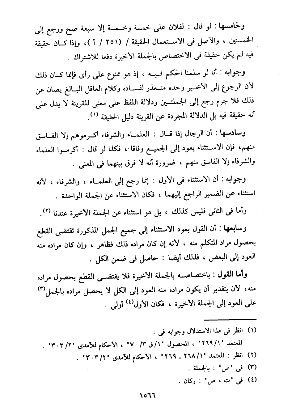 وسابعها: أن القول بعود الاستثناء إلى جميع الجمل المذكورة تقتضي القطع بحصول مراد المتكلم منه، لأنه إذا كان مراده ذلك فظاهر، وإن كان مراده منه العود إلى البعض، فذلك أيضًا: حاصل في ضمن الكل.