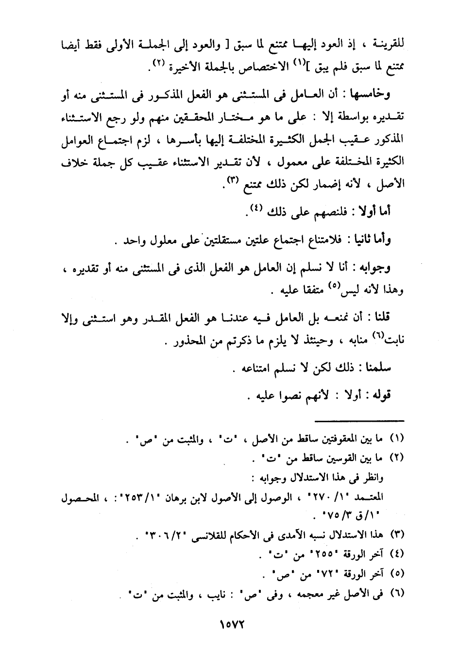 وخامسها: أن العامل في المستثنى هو الفعل المذكور في المستثنى منه أو تقديره بواسطة إلا: على ما هو مختار المحققين منهم ولو رجع الاستثناء المذكور عقيب الجمل الكثيرة المختلفة إليها بأسرها، لزم اجتماع العوامل الكثيرة المختلفة على معمول، لأن تقدير الاستثناء عقيب كل جملة خلاف الأصل، لأنه إضار لكن ذلك ممتنع.