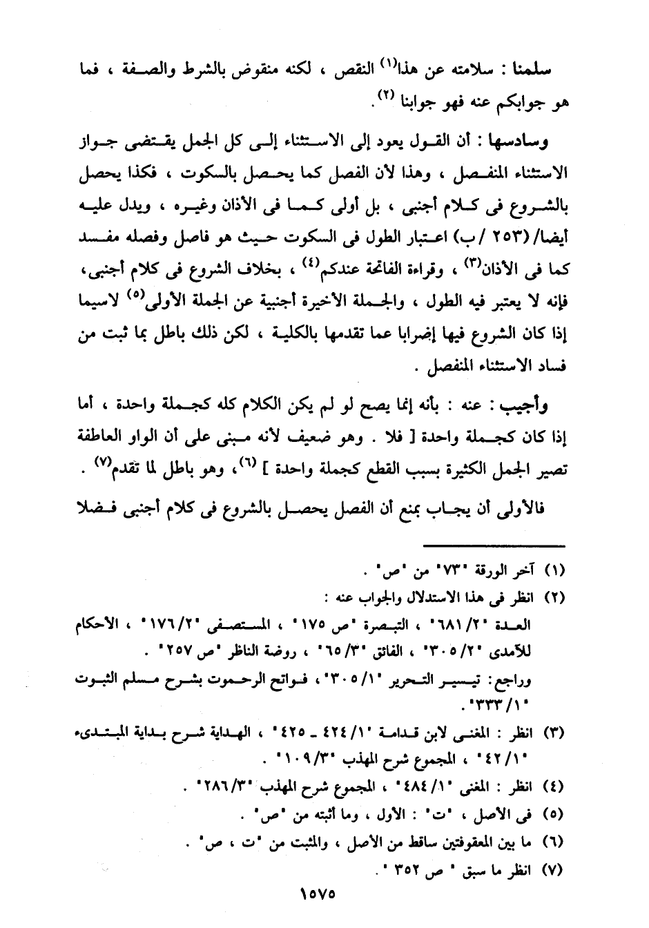 وسادسها: أن القول يعود إلى الاستثناء إلى كل الجمل يقتضي جواز الاستثناء المنفصل، وهذا لأن الفصل كما يحصل بالسكوت، فكذا يحصل بالشروع في كلام أجنبي، بل أولى كما في الأذان وغيره، ويدل عليه أيضا/ (253/ ب) اعتبار الطول في السكوت حيث هو فاصل وفصله مفسد كما في الأذان، وقراءة الفاتحة عندكم، بخلاف الشروع في كلام أجنبي، فإنه لا يعتبر فيه الطول، والجملة الأخيرة أجنبية عن الجملة الأولى لاسيما إذا كان الشروع فيها إضرابًا عما تقدمها بالكلية، لكن ذلك باطل بما ثبت من فساد الاستثناء المنفصل.