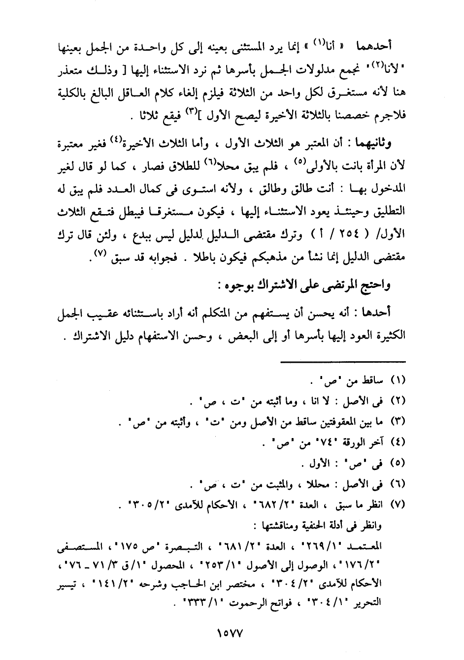 أحدهما "أنا" إنما يرد المستثنى بعينه إلى كل واحدة من الجمل بعينها "لأنا" نجمع مدلولات الجمل بأسرها ثم نرد الاستثناء إليها [وذلك متعذر هنا لأنه مستغرق لكل واحد من الثلاثة فيلزم إلغاء كلام العاقل البالغ بالكلية فلا جرم خصصنا بالثلاثة الأخيرة ليصح الأول] فيقع ثلاثا.