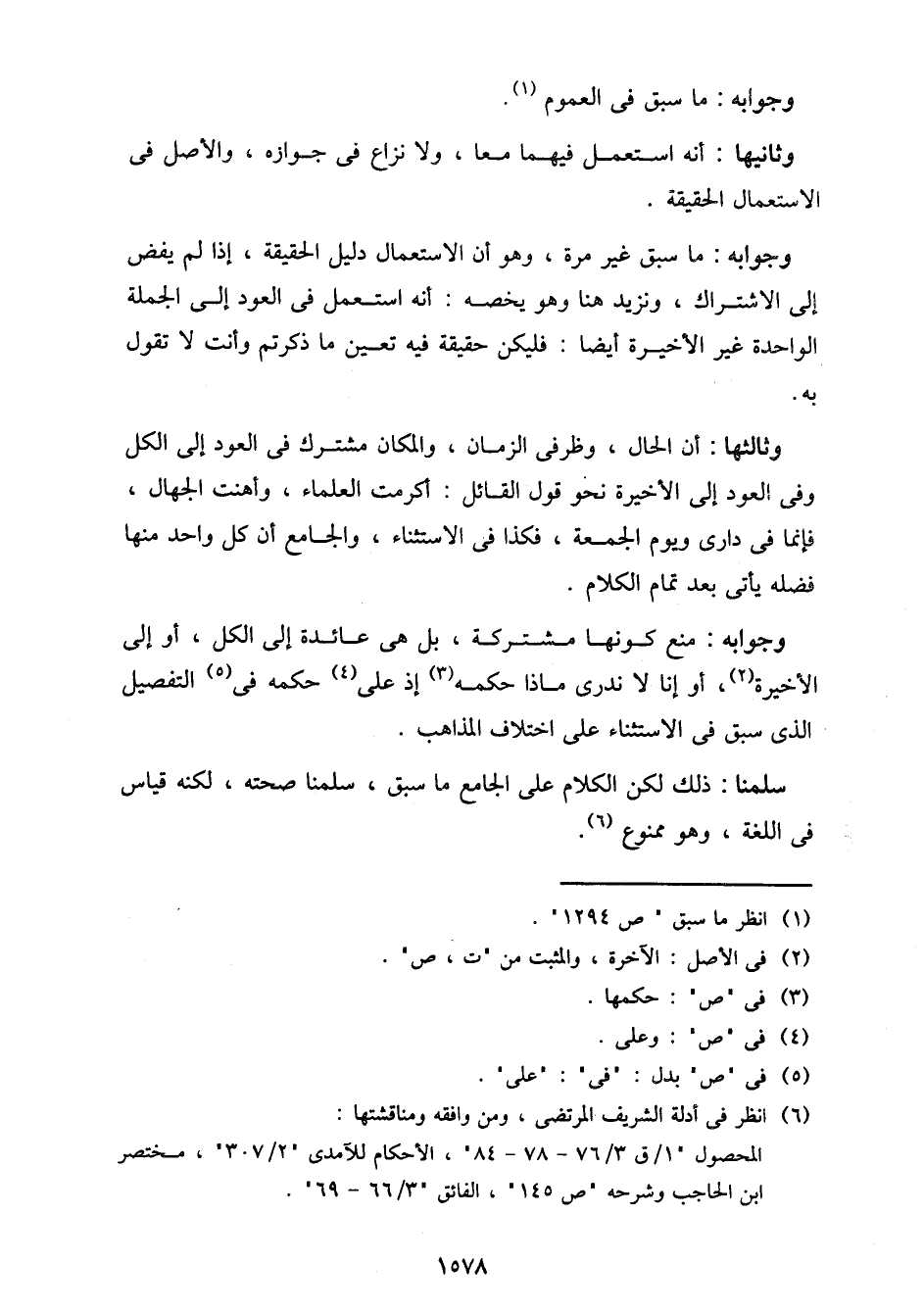 وجوابه: منع كونها مشتركة، بل هي عائدة إلى الكل، أو إلى الأخيرة، أو إنا لا ندري ماذا حكمه إذا على حكمه في التفصيل الذي سبق في الاستثناء على اختلاف المذاهب.