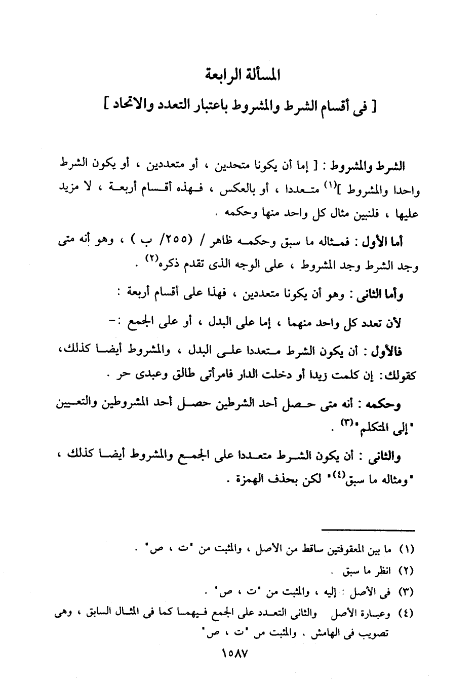 الشرط والمشروط: [إما أن يكونا متحدين، أو متعددين، أو يكون الشرط واحد والمشروط] متعددا، أو بالعكس، فهذه أقسام أربعة، لا مزيد عليها، فلنبين مثال كل واحد منها وحكمه.