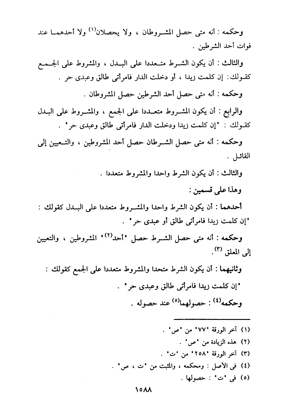 والثالث: أن يكون الشرط متعدد على البدل، والمشروط على الجمع كقولك: إن كلمت زيدا، أو دخلت الدار فامرأتي طالق وعبدي حر.