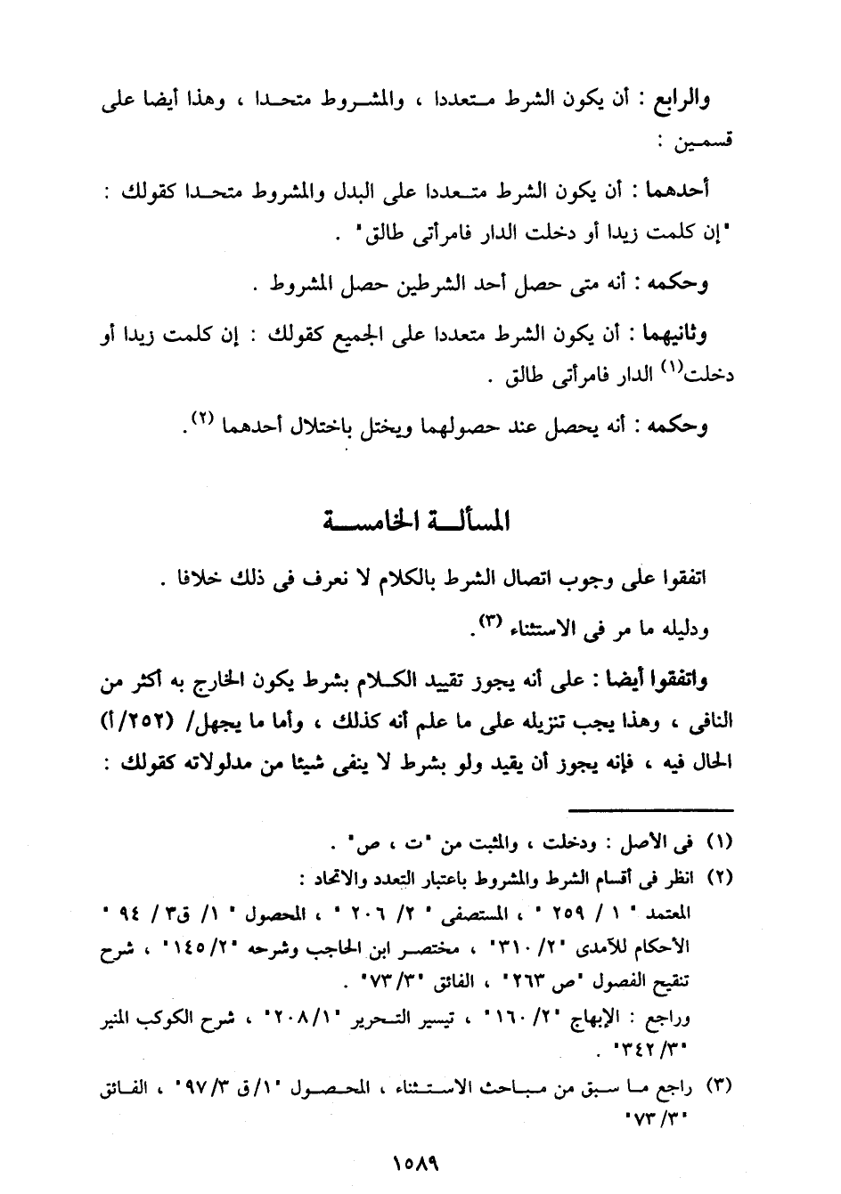 أحدهما: أن يكون الشرط متعددا على البدل والمشروط متحدا كقولك: "إن كلمت زيدا أو دخلت الدار فامرأتي طالق".