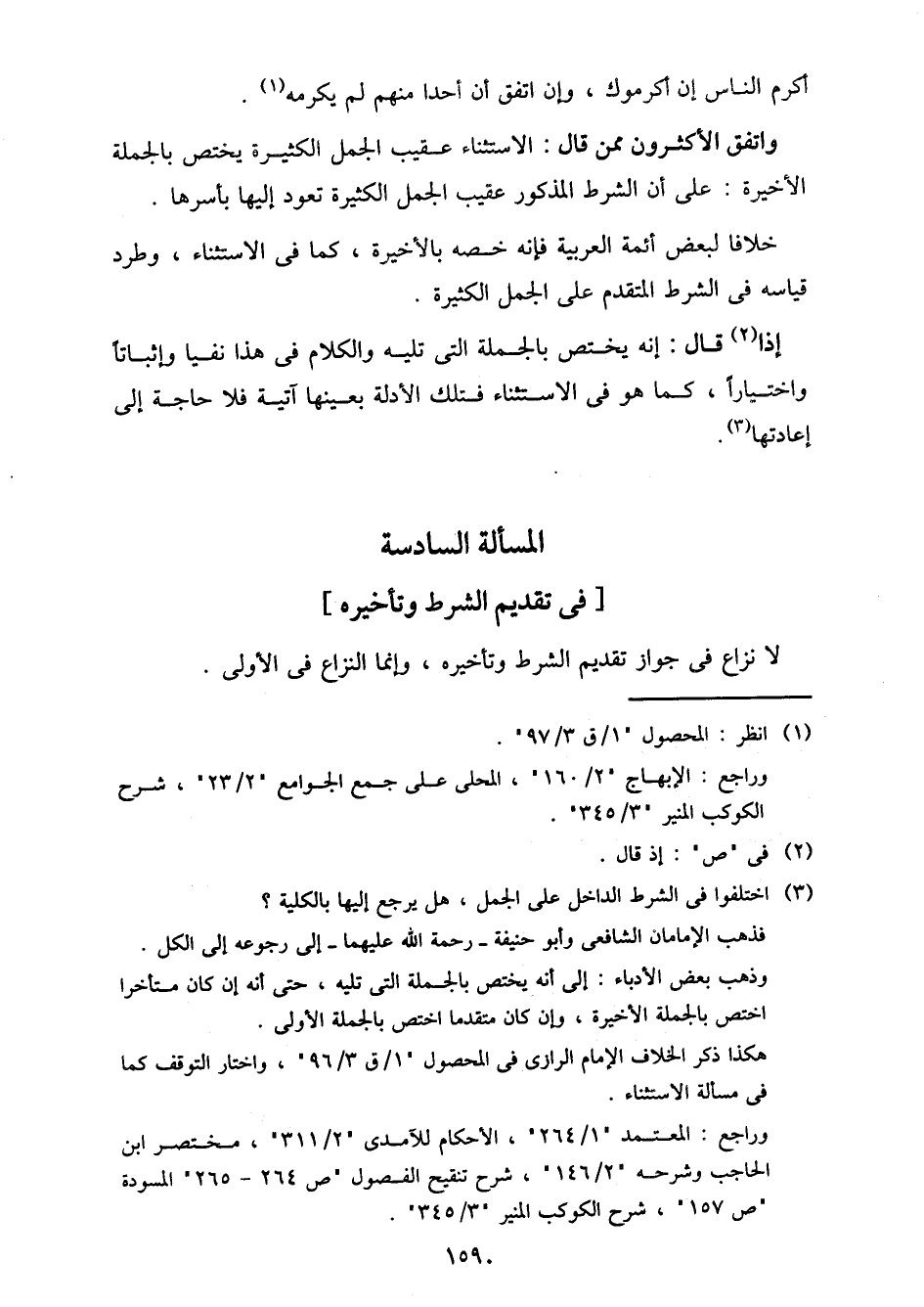 واتفق الأكثرون ممن قال: الاستثناء عقيب الجمل الكثيرة يختص بالجملة الأخيرة: على أن الشرط المذكور عقيب الجمل الكثيرة تعود إليها بأسرها.
