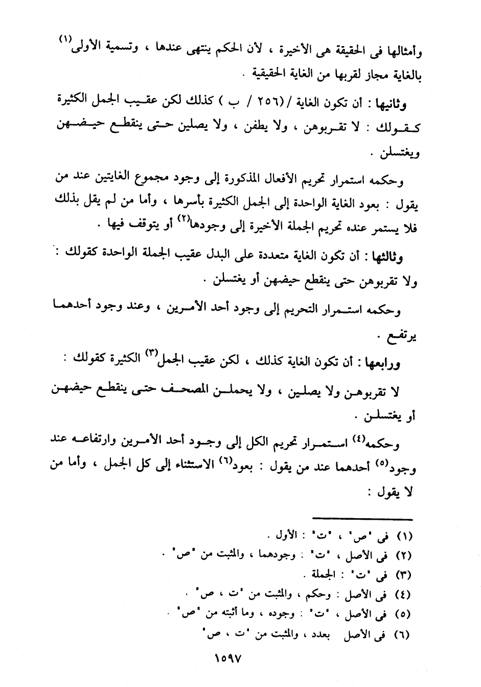 وثانيها: أن تكون الغاية/ (256/ ب) كذلك لكن عقيب الجمل الكثيرة كقولك: لا تقربوهن، ولا يطفن، ولا يصلين حتى ينقطع حيضهن ويغتسلن.