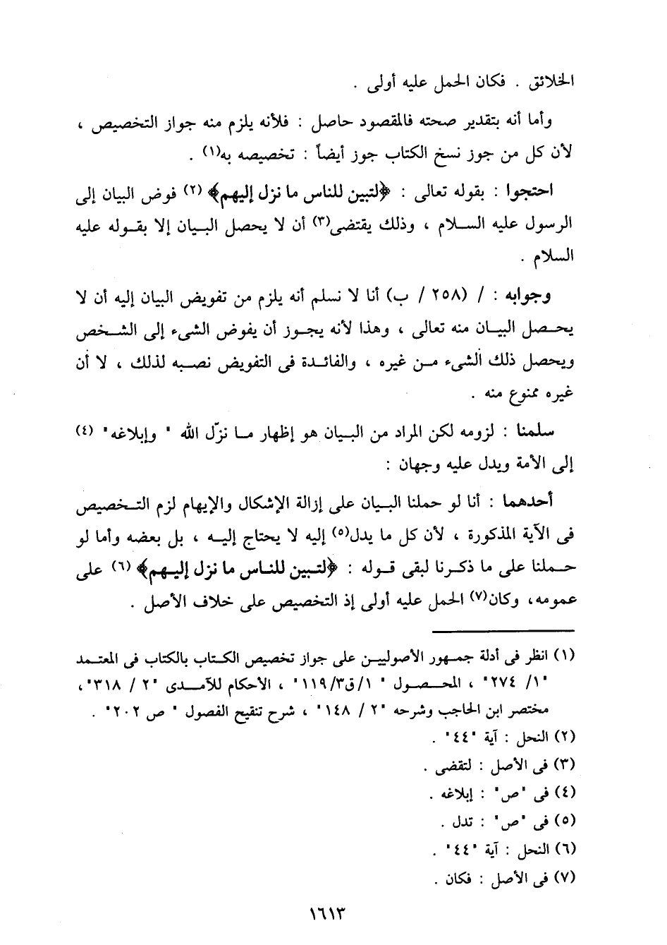 وجوابه: / (258/ ب) أنا لا نسلم أنه يلزم من تفويض البيان إليه أن لا يحصل البيان منه تعالى، وهذا لأنه يجوز أن يفض الشيء إلى الشخص ويحصل ذلك الشيء من غيره، والفائدة في التفويض نصبه لذلك، لا أن غيره ممنوع منه.