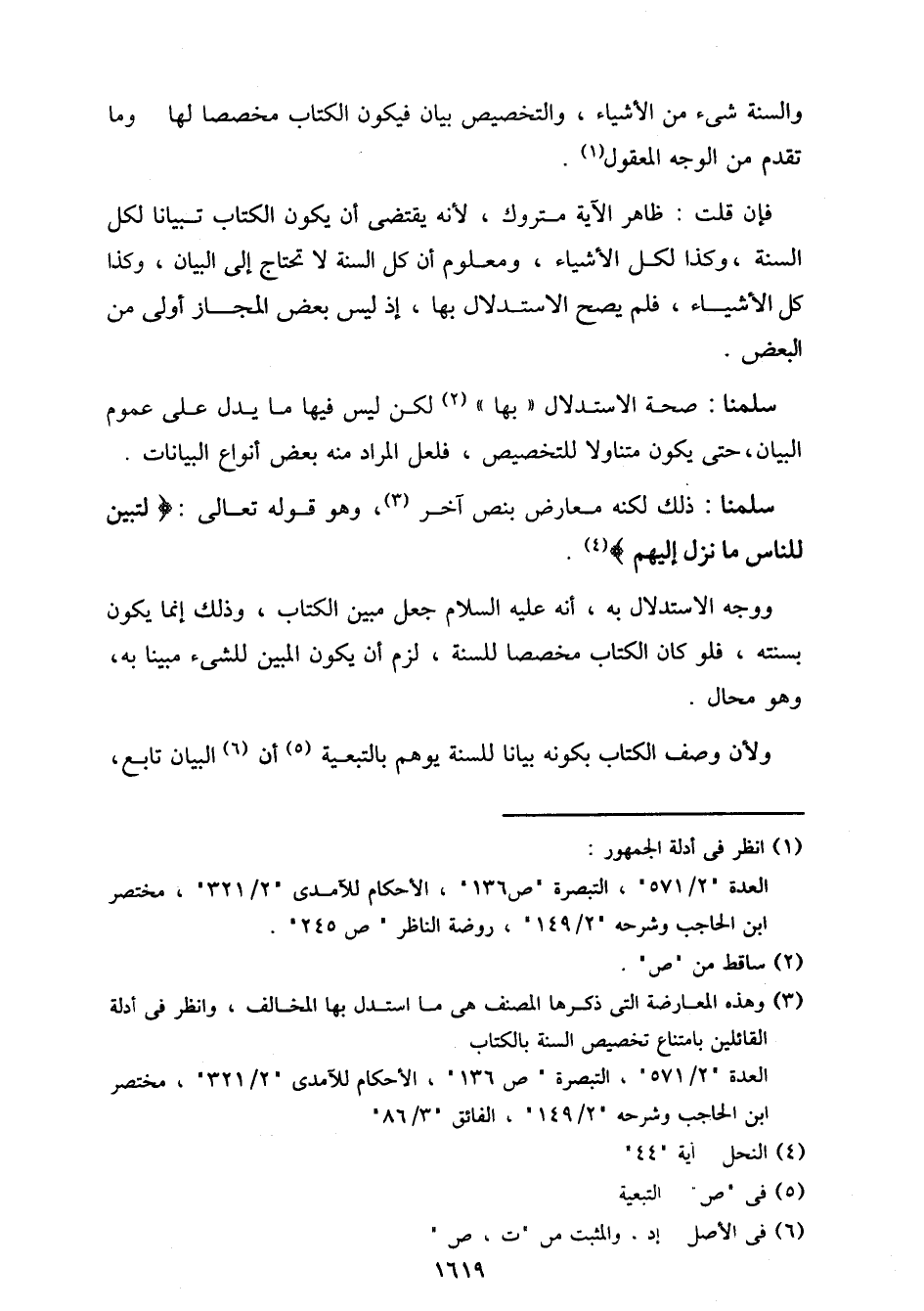 فإن قلت: ظاهر الآية متروك، لأنه يقتضي أن يكون الكتاب تبيانًا لكل السنة، وكذا لكل الأشياء، ومعلوم أن كل السنة لا تحتاج إلى البيان، وكذا كل الأشياء، فلم يصح الاستدلال بها، إذ ليس بعض المجاز أولى من البعض.