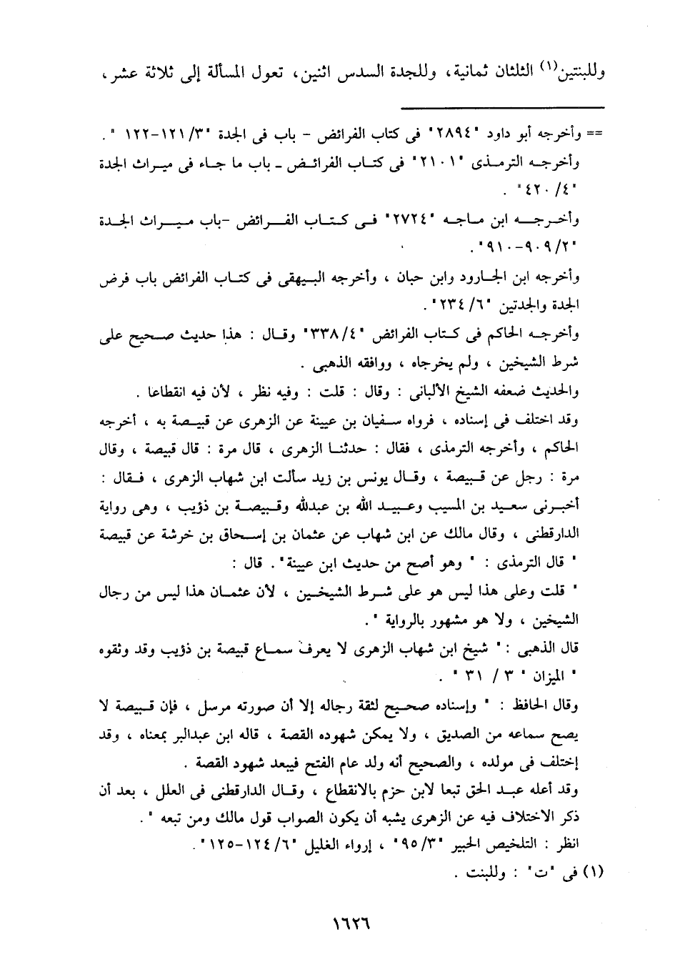 وللبنتين الثلثان ثمانية، وللجدة السدس اثنين، تعول المسألة إلى ثلاثة عشر،