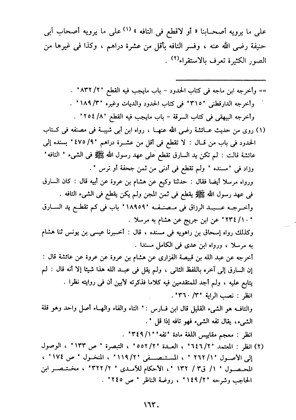 على ما يرويه أصحابنا "أو لا قطع في التافه" على ما يرويه أصحاب أبي حنيفة رضي الله عنه، وفسر التافه بأقل من عشرة دراهم، وكذا في غيرها من الصور الكثيرة تعرف بالاستقراء.