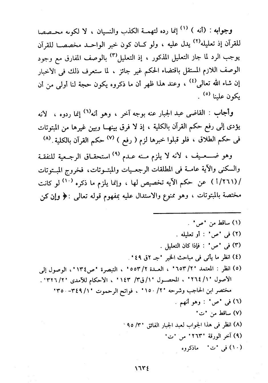 وأجاب: القاضي عبد الجبار عنه بوجه آخر، وهو أنه إنما ردوه، لأنه يؤدي إلى رفع حكم القرآن بالكلية، إذ لا فرق بينها وبين غيرها من البتوتات في حكم الطلاق، فلو قبلوا خبرها لزم (رفع) حكم القرآن بالكلية.