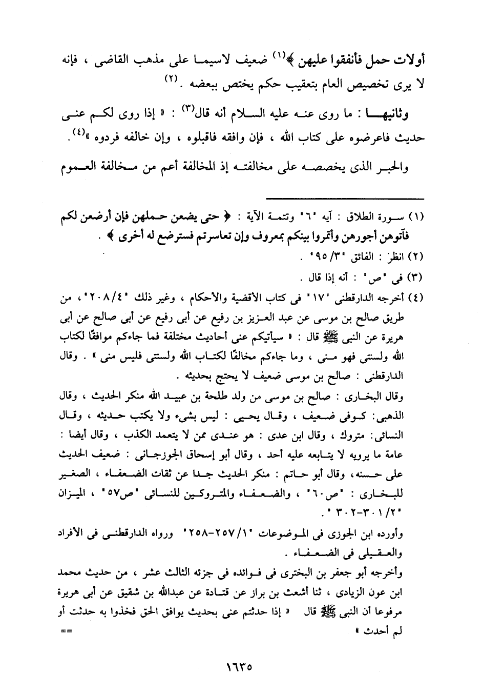 أولات حمل فأنفقوا عليهن} ضعيف لاسيما على مذهب القاضي، فإنه لا يرى تخصيص العام بتعقيب حكم يختص ببعضه.